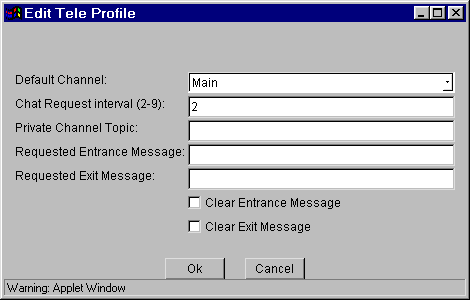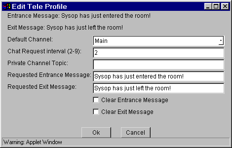 To clear existing Entrance/Exit messages, click on the Clear Entrance Message and/or Clear Exit Message check boxes. Be sure to click on the OK button to submit the information to the Server. Click the Cancel button to Exit. When an Entrance/Exit Message has been approved, it displays on the top of the Tele Profile Editor top-level window, as:
