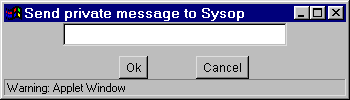 A whisper is a message that can be viewed only by its intended recipient. Select this option to load a top level window into which you may type a message to whisper to the selected user. Click the OK button to send the whisper. Click Cancel to unload the window. You can also whisper to a user by typing /<username> <message> in the message input field. This option is user-specific and is disabled unless a user is selected in the Users or Channels Tree Control.