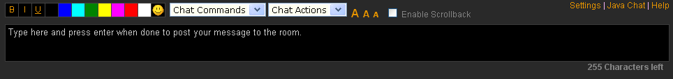 This is where messages and commands can be typed in. When you type in a message, press the <ENTER> key. You will see your message echoed back to you in the Message Frame or if you typed a command, the appropriate response to the command will be displayed. You can change text color, font and insert emoticons into your message by clicking on the appropriate icons above the message. If you wish to highlight, italic, or underline only a portion of you text, you can highlight your text and click the appropriate button. The system will insert special characters to perform the conversion, do not remove them. |
